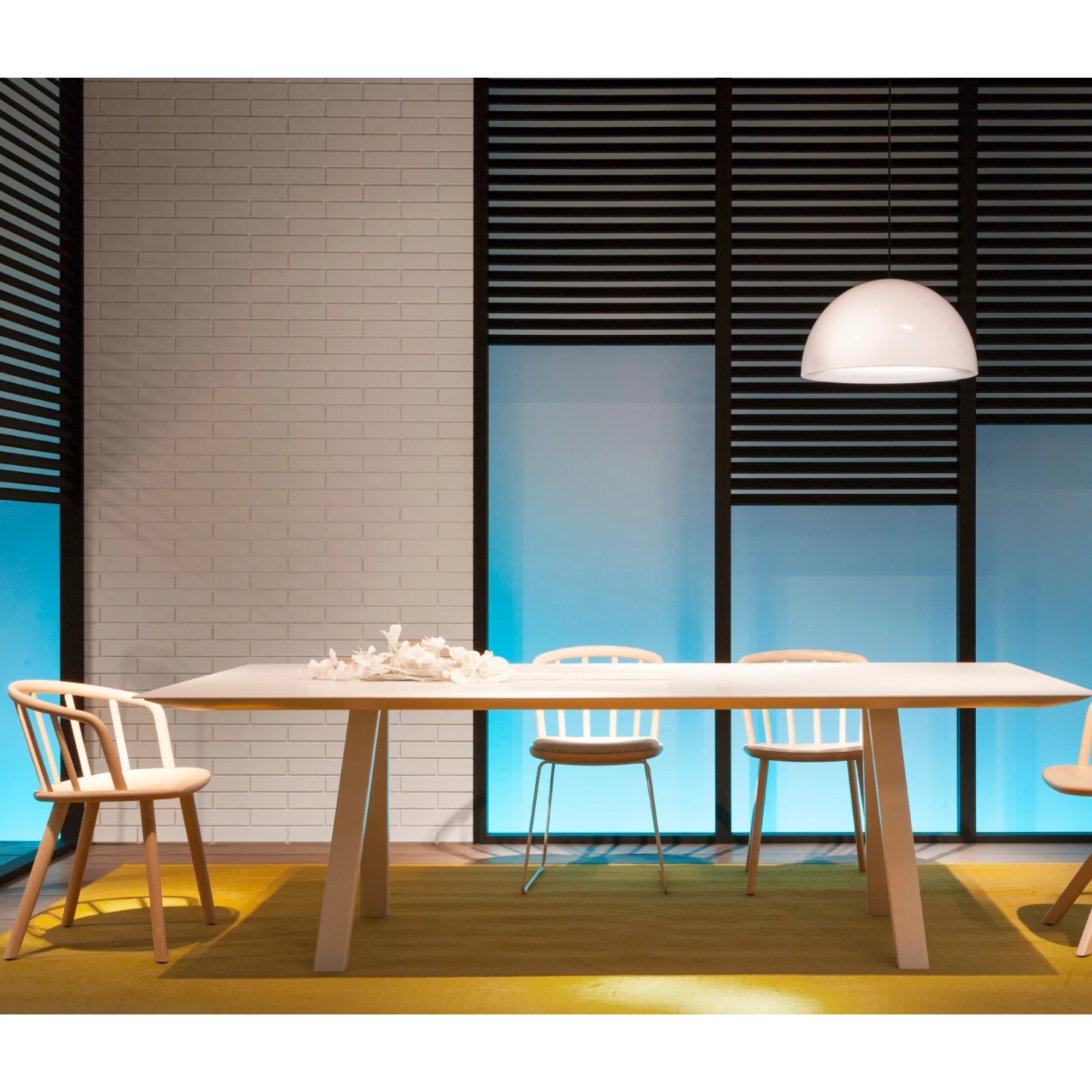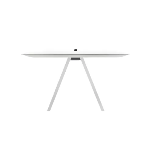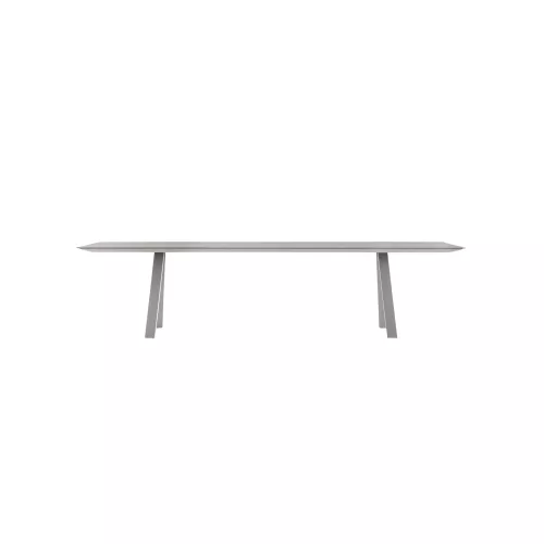 Masă cu picioare solide tip trestle din oțel și blat susținut de un cadru rezistent din aluminiu extrudat. Combinația materialelor oferă stabilitate și un aspect modern, industrial.