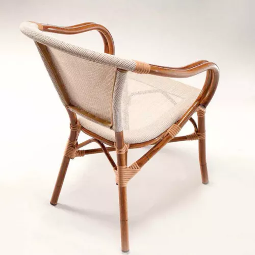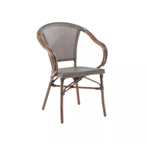 Bertha A este un scaun de exterior empilabil, cu brațe, ideal pentru terase horeca. Are cadru din aluminiu cu aspect de lemn și șezut și spătar din textilenă, rezistente la uz și intemperii. Se potrivește în diverse amenajări exterioare și stiluri de design.