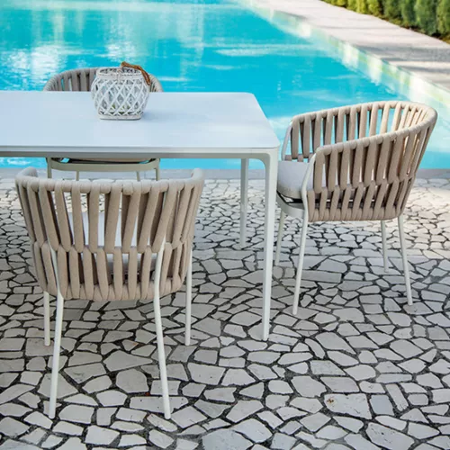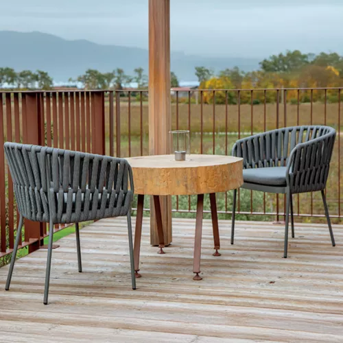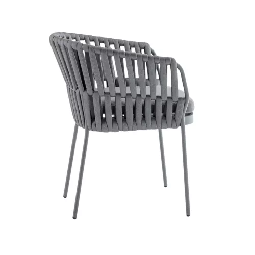 Boho este un scaun de exterior cu cotiere, foarte stabil și rezistent, cu cadru din aluminiu și împletit cu frânghie acrilică. Include pernă tapițată cu stofă Olefin. Este stivuibil și perfect pentru orice terasă HoReCa.