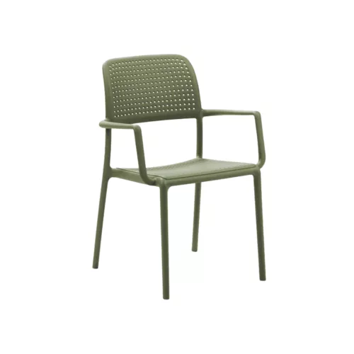 Bora este un scaun de exterior rezistent și ușor, realizat din polipropilenă reciclabilă cu aditivi UV. Structura monobloc și bratele oferă stabilitate și confort. Este stivuibil și disponibil în mai multe culori, fiind ideal pentru terase horeca și alte spații exterioare. O soluție practică ce îmbină designul cu funcționalitatea.