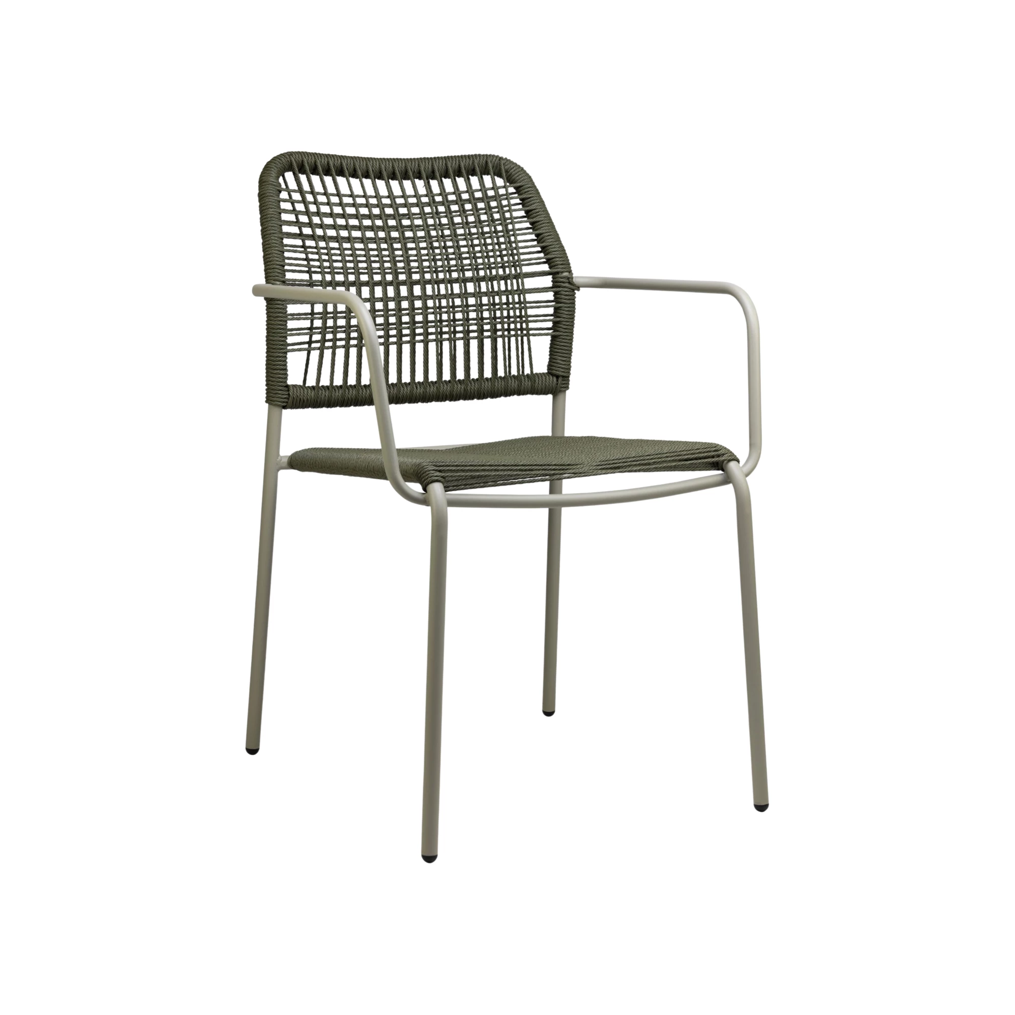 Împletitura din frânghie este rezistentă la intemperii și adaptată utilizării profesionale la exterior, iar structura stivuibilă permite depozitarea eficientă.