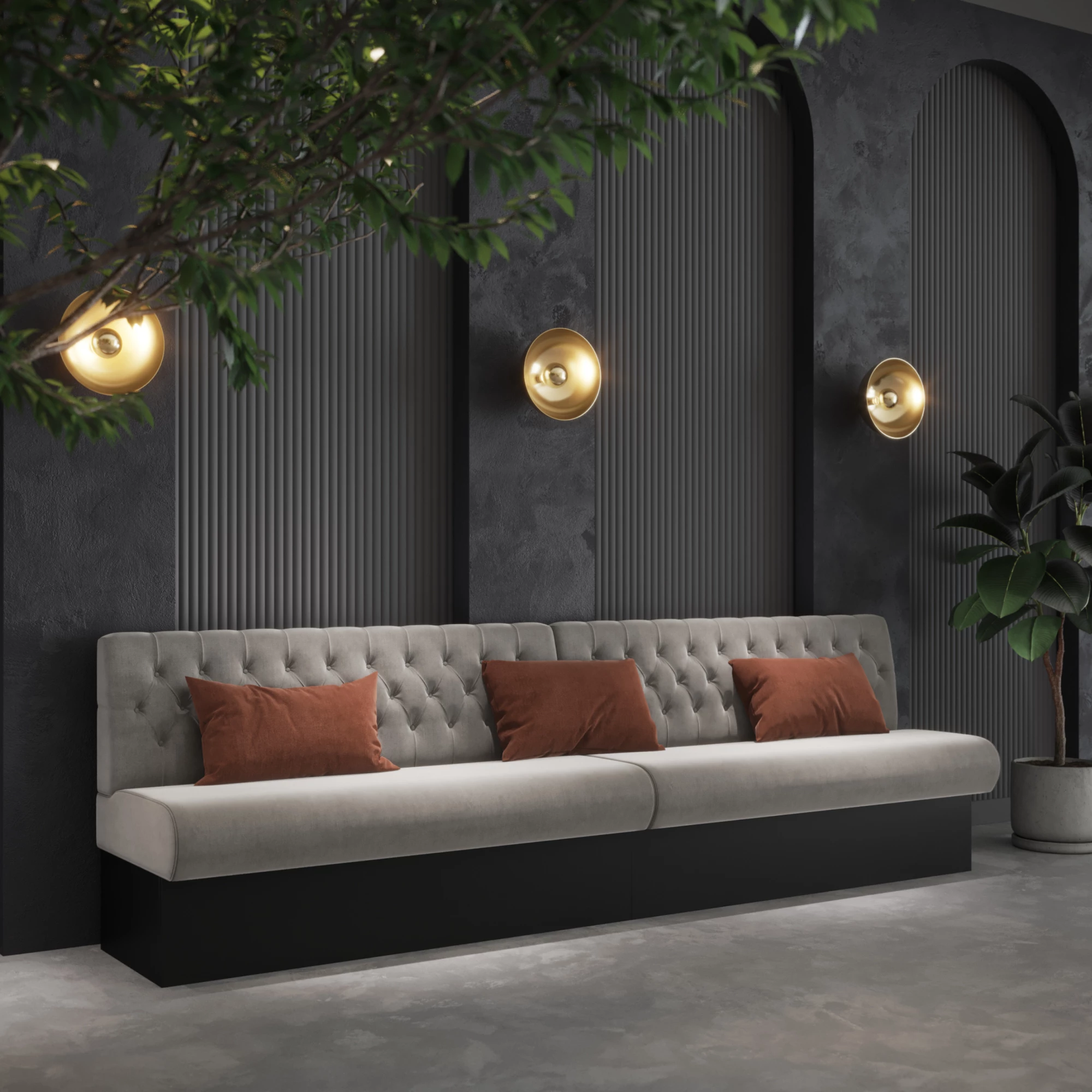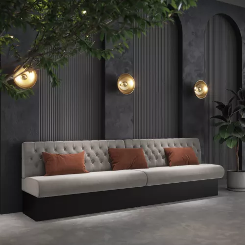 Donald Bench Capitons Foldings este o banchetă tapițată elegantă, cu capitonaje și pliuri rafinate pe spătar, inspirate din stilul Chesterfield. Dispune de arcuri nosag și spumă de înaltă densitate, oferind confort și durabilitate. Disponibilă într-o gamă variată de textile profesionale, este ideală pentru spații HORECA elegante.