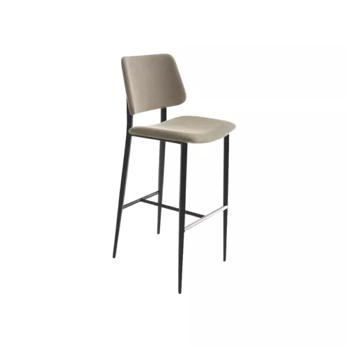 Un scaun de bar elegant, care îmbină materialele moderne cu accente naturale. Baza metalică vopsită oferă stabilitate și un aspect rafinat, iar șezutul și spătarul pot fi tapițate în piele, piele ecologică sau stofă, în funcție de stilul dorit. Pentru un plus de căldură și personalitate, partea din spate a spătarului poate fi realizată din lemn. Ideal pentru baruri, restaurante și spații horeca sofisticate.