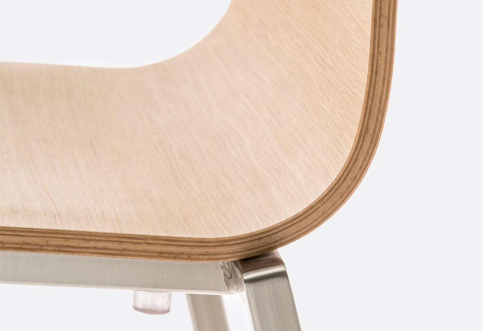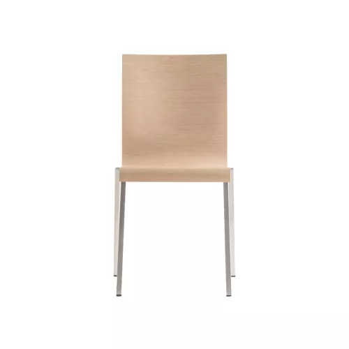 Kuadra 1321 îmbină eleganța minimalistă cu un design ergonomic. Carcasa curbată din placaj furniruit cu stejar oferă confort, iar cadrul din oțel 20x20 mm adaugă stabilitate. Se pot stivui până la 8 bucăți – perfectă pentru spații moderne.