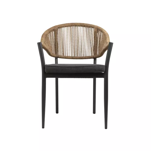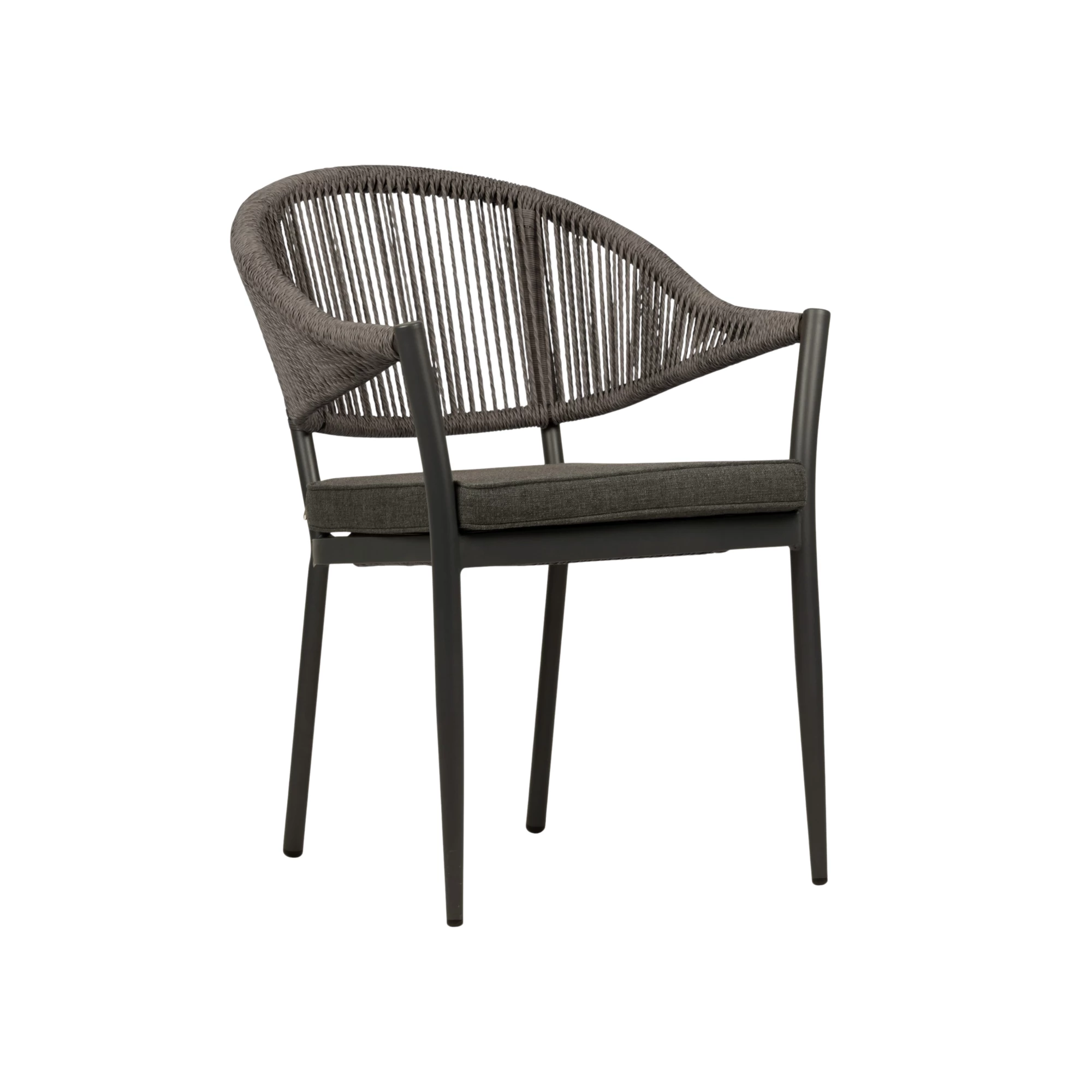Creat pentru terase moderne și spații HoReCa, acest scaun de exterior are un cadru solid din aluminiu antracit, completat de împletitură din frânghie rezistentă la UV. Structura aerisită oferă un aspect actual și asigură rezistență în utilizarea zilnică la exterior.