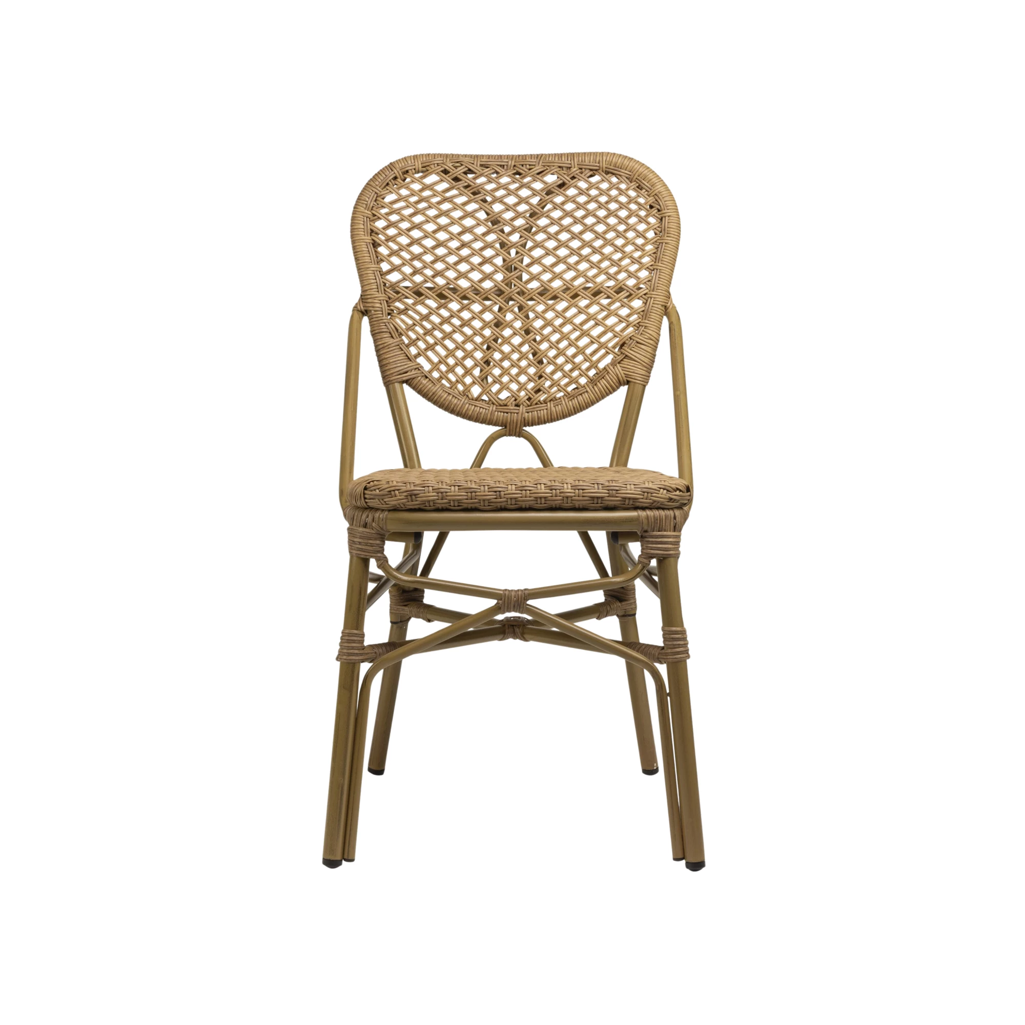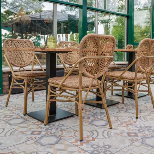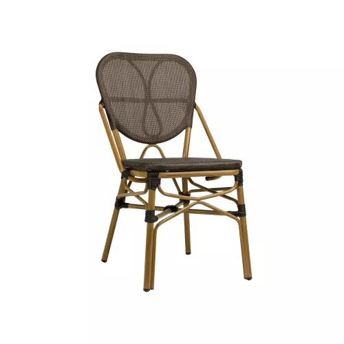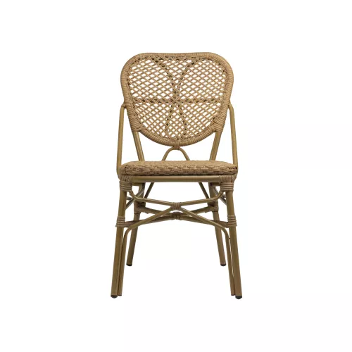 Scaunul de terasă Mandi este conceput pentru utilizare îndelungată la exterior. Este realizat cu împletitură din textilenă rezistentă la UV, care își păstrează culoarea și aspectul în timp, chiar și în condiții de expunere constantă la soare. Cadrul din aluminiu, finisat în nuanță naturală și vopsit în câmp electrostatic, este rezistent la zgârieturi și potrivit pentru utilizare zilnică în spații HoReCa. Scaunul este stivuibil, ceea ce permite o depozitare rapidă și eficientă.
