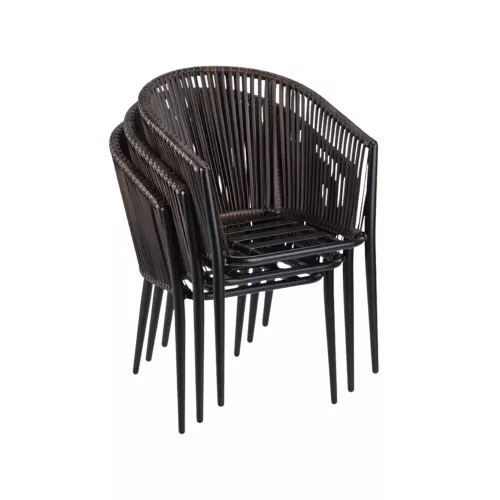 Scaun de terasă superpozabil, cu cadru din aluminiu vopsit în câmp electrostatic, negru. Șezutul și spătarul au o formă rotunjită, realizate din polietilenă (P.E.), culoare maro. Include pernă de șezut antracit. Rezistent la UV și la intemperii – ideal pentru utilizare în spații HoReCa exterioare.