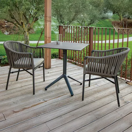 Descoperă Mason, un scaun de exterior cu cotiere, elegant și suprapozabil, realizat din aluminiu durabil. Cadru antracit învelit în sfoară textilenă taupe și ecowicker, combinând designul modern cu materiale rezistente la intemperii. Perna confortabilă, tapițată cu stofă Olefin maro. Ideal pentru orice terasă horeca.