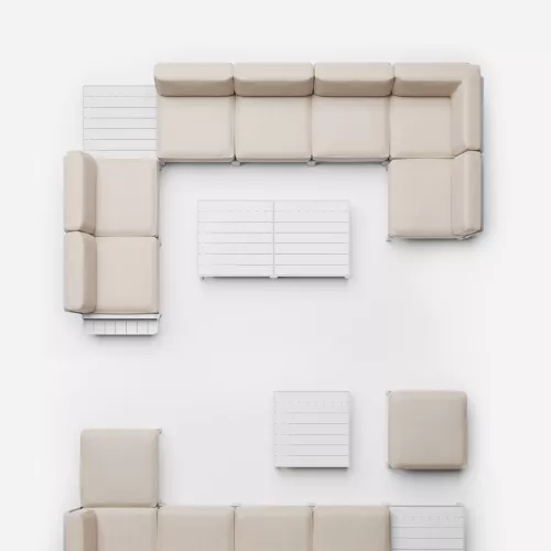 Maximo Elemento Angolo este un modul de colț dintr-un sistem modular de canapele de exterior. Structura este din rășină de polipropilenă cu fibră de sticlă regenerată, colorată uniform și rezistentă la UV. Permite montarea spătarului și a brațelor pe toate laturile fără unelte. Pernele sunt detașabile, cu husă prevăzută cu fermoar – ideal pentru terase horeca.