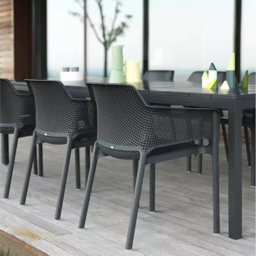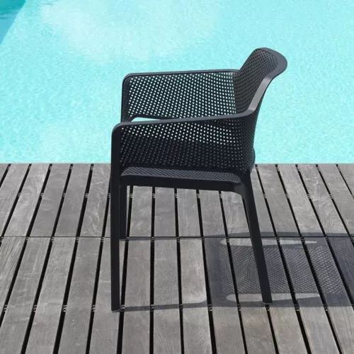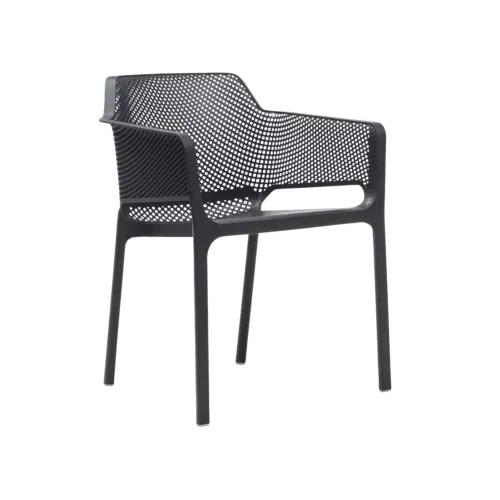Net este un scaun de exterior modern, destinat locațiilor horeca, cu cadru monobloc din polipropilenă și brațe. Decorat cu un model radial perforat pe toată suprafața șezutului și spătarului. Disponibil în mai multe culori, rezistent la UV și intemperii, cu finisaj mat.
