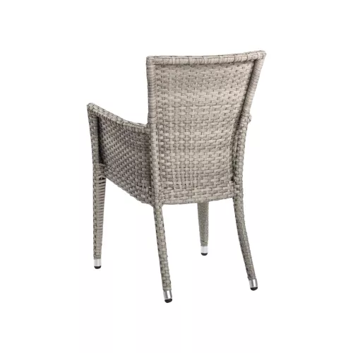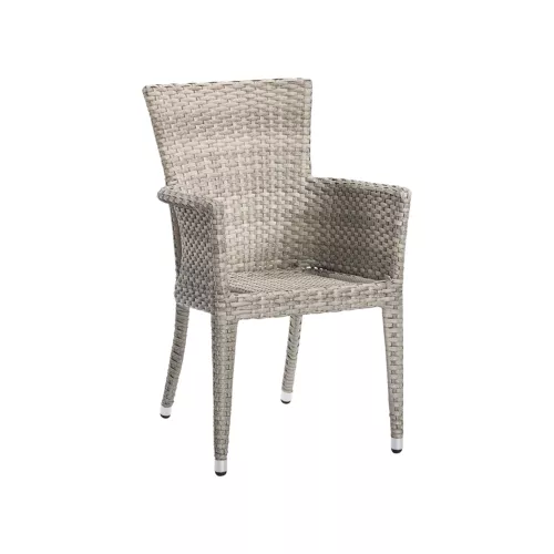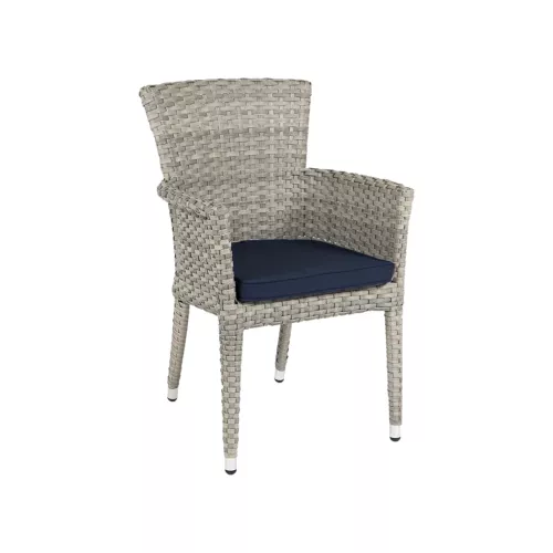 Olga este un scaun de exterior cu brațe, destinat exclusiv locațiilor horeca. Are cadru din aluminiu cu finisaj mat argintiu, șezut și spătar din fibre sintetice plate, culoare cenușiu. Perna albastru marin este inclusă. Rezistent la UV și intemperii, stivuibil până la 6 bucăți.