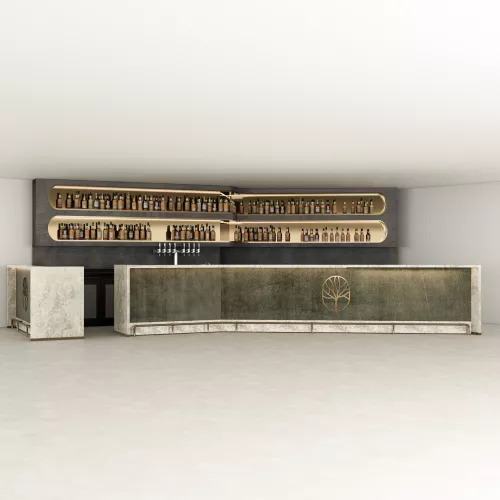 This custom-designed bar showcases a modern, linear layout with a refined stone-effect finish and illuminated shelving. The front counter is highlighted with a decorative emblem, creating a strong visual identity for the space. Behind the bar, floating shelves with integrated lighting provide an elegant display for bottles, combining functionality with striking aesthetics. Ideal for contemporary hospitality concepts, this bar design blends durability, sophistication, and brand character.