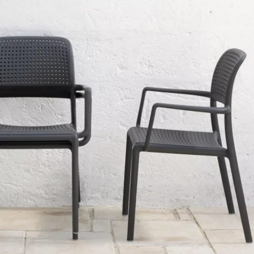 Bora este un scaun de exterior rezistent și ușor, realizat din polipropilenă reciclabilă cu aditivi UV. Structura monobloc și bratele oferă stabilitate și confort. Este stivuibil și disponibil în mai multe culori, fiind ideal pentru terase horeca și alte spații exterioare. O soluție practică ce îmbină designul cu funcționalitatea.