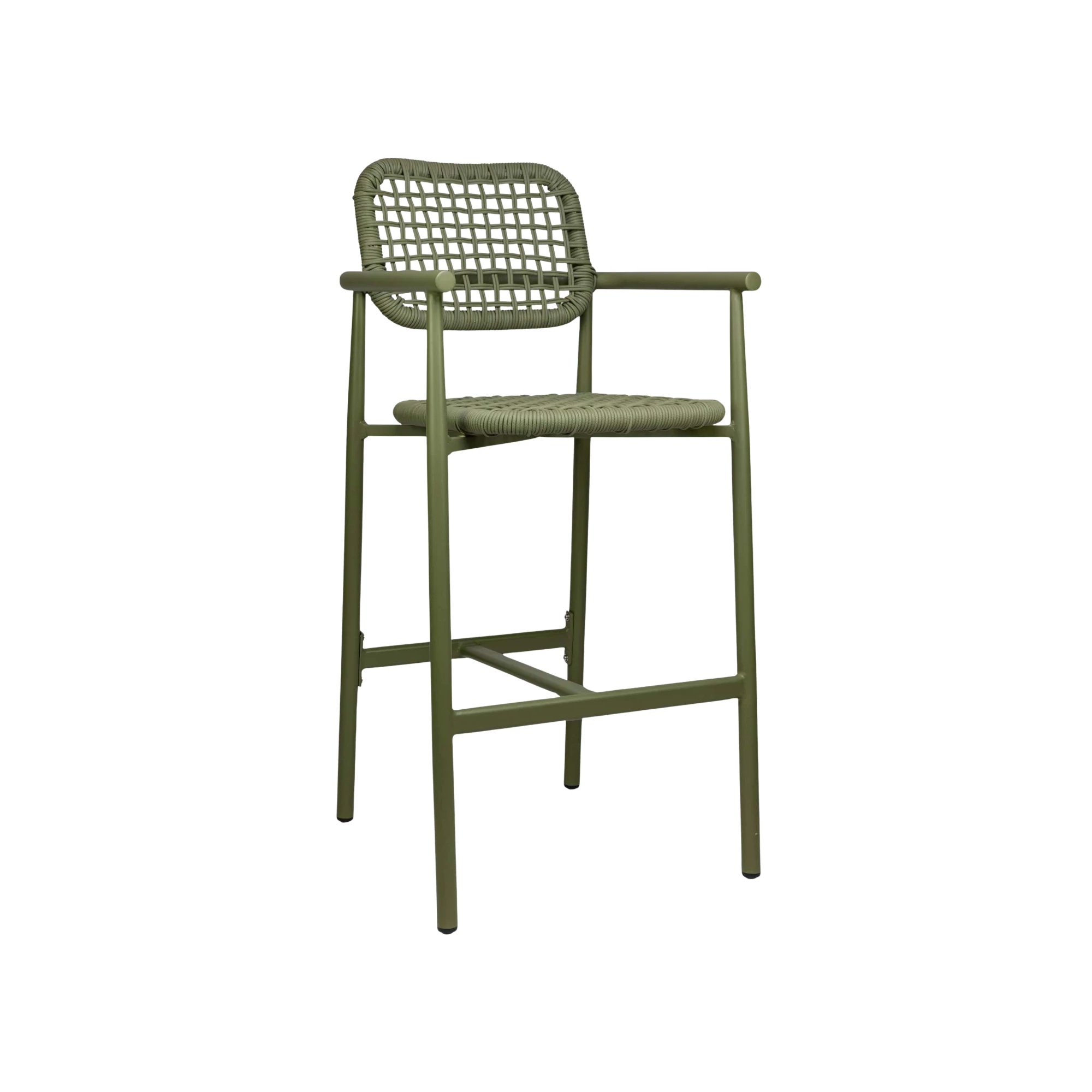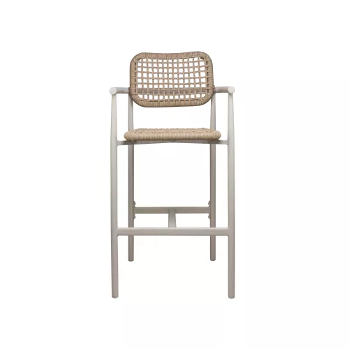 Acest scaun de bar pentru terasă este conceput pentru spațiile exterioare din domeniul HORECA, unde durabilitatea și confortul sunt esențiale. Cadrul solid din aluminiu oferă stabilitate, păstrând în același timp o greutate redusă, iar finisajul vopsit în câmp electrostatic îl protejează în utilizarea la exterior. Brațele integrate oferă un plus de confort și susținere, contribuind la o poziție relaxată la ședere, potrivită pentru mesele înalte sau zonele de bar. Designul echilibrat îl face ușor de integrat pe terasele cafenelelor și restaurantelor.