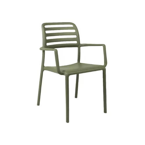 Costa este un scaun de exterior modern, cu cotiere, realizat din polipropilenă ranforsată cu fibră de sticlă și aditivi UV. Spătarul cu lamele și cadrul curbat fără îmbinări oferă confort și stil. Ușor, practic și stivuibil.