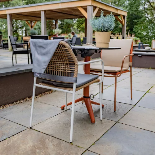 Scaunul de terasă Crest îmbină confortul cu un design contemporan, fiind potrivit pentru terasele din domeniul horeca. Este disponibil în portocaliu, alb/natural și verde, oferind un aspect proaspăt și echilibrat spațiilor exterioare.