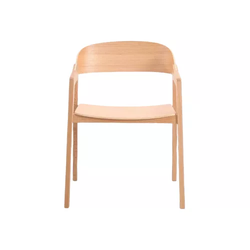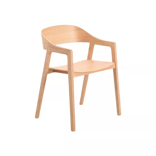 Scaun contemporan din stejar cu brațe integrate și spătar curbat, conturat elegant. Realizat din stejar masiv de înaltă calitate, acest scaun oferă atât rafinament, cât și durabilitate, ideal pentru mediile HoReCa exigente. Conceput pentru a aduce confort și stil în spațiile moderne de dining și lounge.