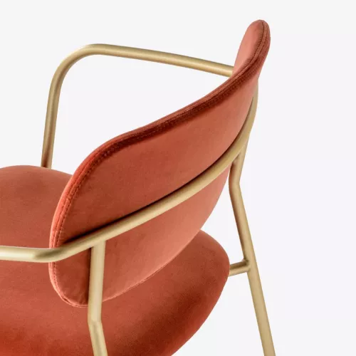 Un echilibru rafinat între forme, ergonomie și eleganță subtilă definește acest scaun cu brațe. Șezutul și spătarul tapițate, separate printr-o deschidere funcțională, creează o siluetă aerisită și delicată, oferind în același timp confort învăluitor. Structura este susținută de un cadru subțire din oțel, care adaugă un accent modern și sofisticat. Personalizarea este posibilă datorită varietății de tapițerii din material textil sau piele și opțiunilor multiple de finisaj pentru oțel, integrându-se perfect în restaurante elegante, lounge-uri moderne sau spații hoteliere premium.
