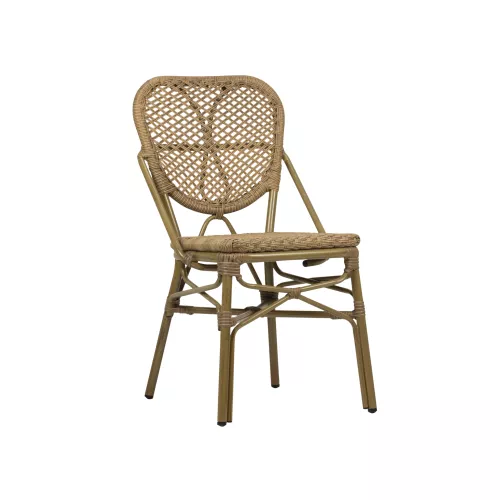 Scaunul de terasă Mandi este conceput pentru utilizare îndelungată la exterior. Este realizat cu împletitură din textilenă rezistentă la UV, care își păstrează culoarea și aspectul în timp, chiar și în condiții de expunere constantă la soare. Cadrul din aluminiu, finisat în nuanță naturală și vopsit în câmp electrostatic, este rezistent la zgârieturi și potrivit pentru utilizare zilnică în spații HoReCa. Scaunul este stivuibil, ceea ce permite o depozitare rapidă și eficientă.
