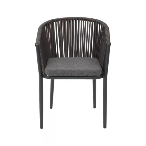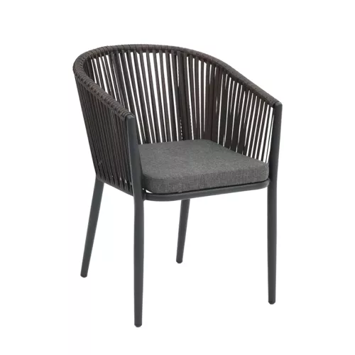 Scaun de terasă superpozabil, cu cadru din aluminiu vopsit în câmp electrostatic, negru. Șezutul și spătarul au o formă rotunjită, realizate din polietilenă (P.E.), culoare maro. Include pernă de șezut antracit. Rezistent la UV și la intemperii – ideal pentru utilizare în spații HoReCa exterioare.