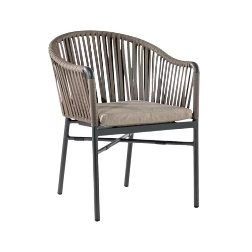 Descoperă Mason, un scaun de exterior cu cotiere, elegant și suprapozabil, realizat din aluminiu durabil. Cadru antracit învelit în sfoară textilenă taupe și ecowicker, combinând designul modern cu materiale rezistente la intemperii. Perna confortabilă, tapițată cu stofă Olefin maro. Ideal pentru orice terasă horeca.