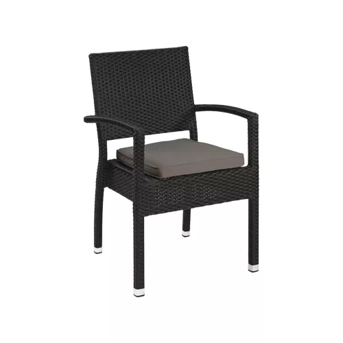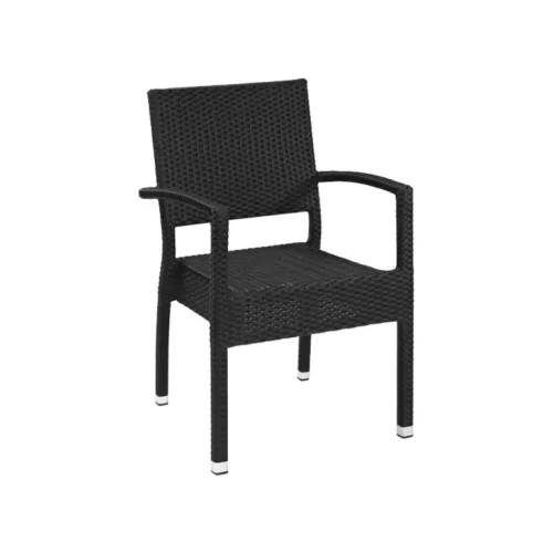 Mond A este un scaun de exterior cu brațe, creat pentru utilizare în locații horeca. Are cadru din aluminiu vopsit în câmp electrostatic și șezut/spătar din ratan sintetic plat, negru. Este rezistent la intemperii și UV, stivuibil până la 8 bucăți – ideal pentru terase.
