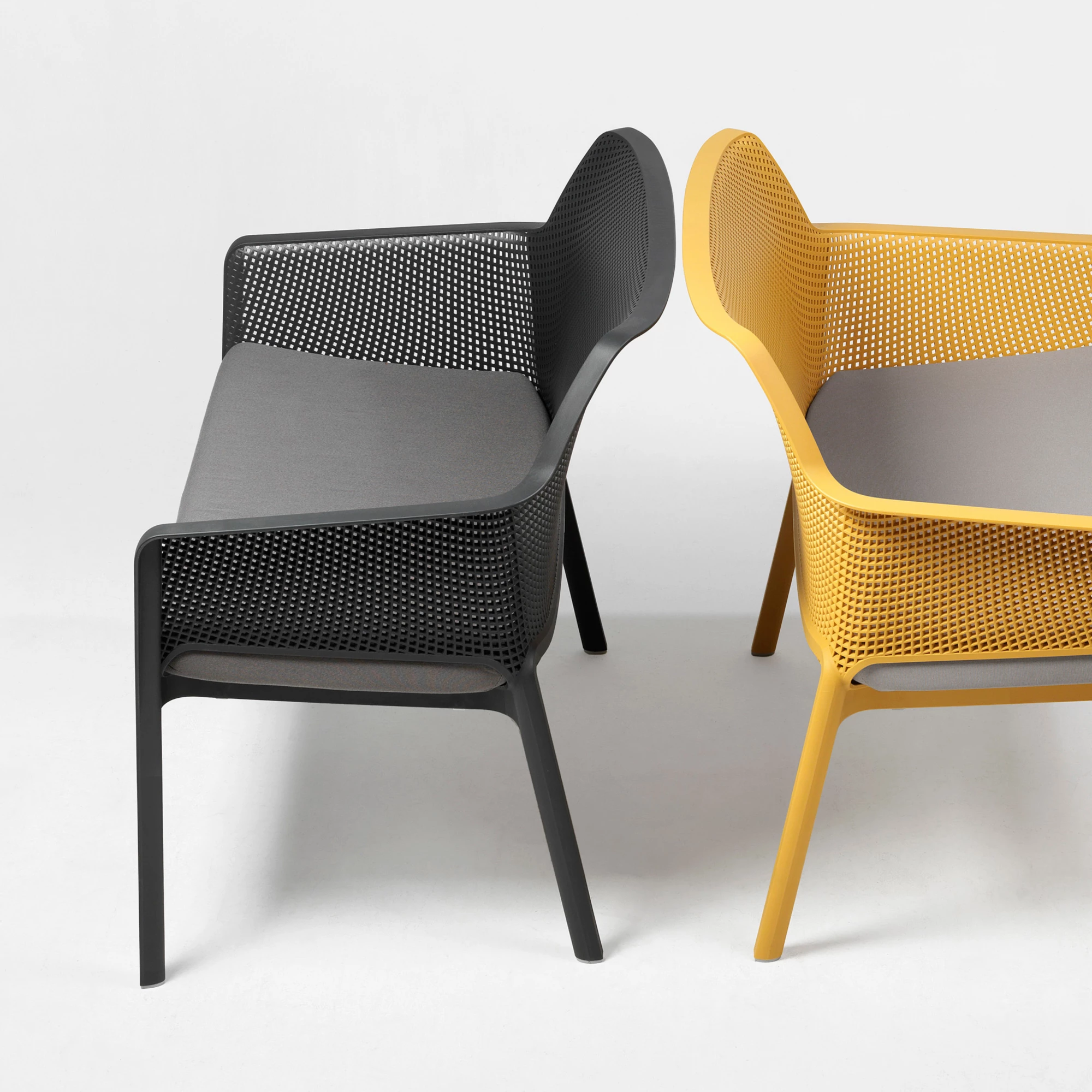 Net Bench este o bancheta elegantă și practică, creată pentru performanță ridicată în spațiile comerciale exterioare. Fabricată din polipropilenă cu fibră de sticlă monobloc, cu aditivi UV și finisaj mat rafinat, oferă durabilitate excelentă, rezistență la intemperii și stabilitate a culorii. Dispune de picioare antiderapante și design stivuibil pentru depozitare ușoară. Disponibilă în șase culori elegante pentru cadru—Alb, Antracit, Salice, Tortora, Senape, Coral—poate fi echipată cu pernă din spumă poliuretanică (densitate 28 kg/m³) în nuanțe Grey Stone, Rosa Quarzo, Senape, Denim, The Verde, Sardinia, Alb sau Gri. Complet reciclabilă, ideală pentru terase de restaurante, cafenele și bistrouri ce doresc confort, stil și calitate durabilă.