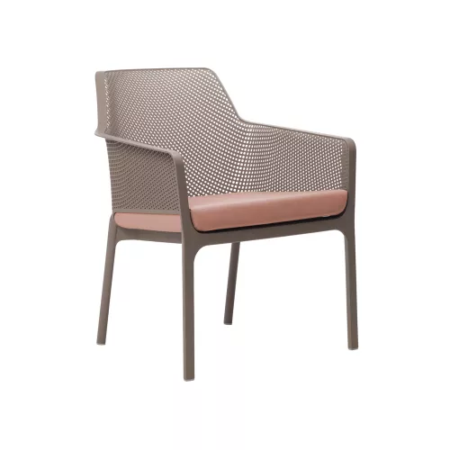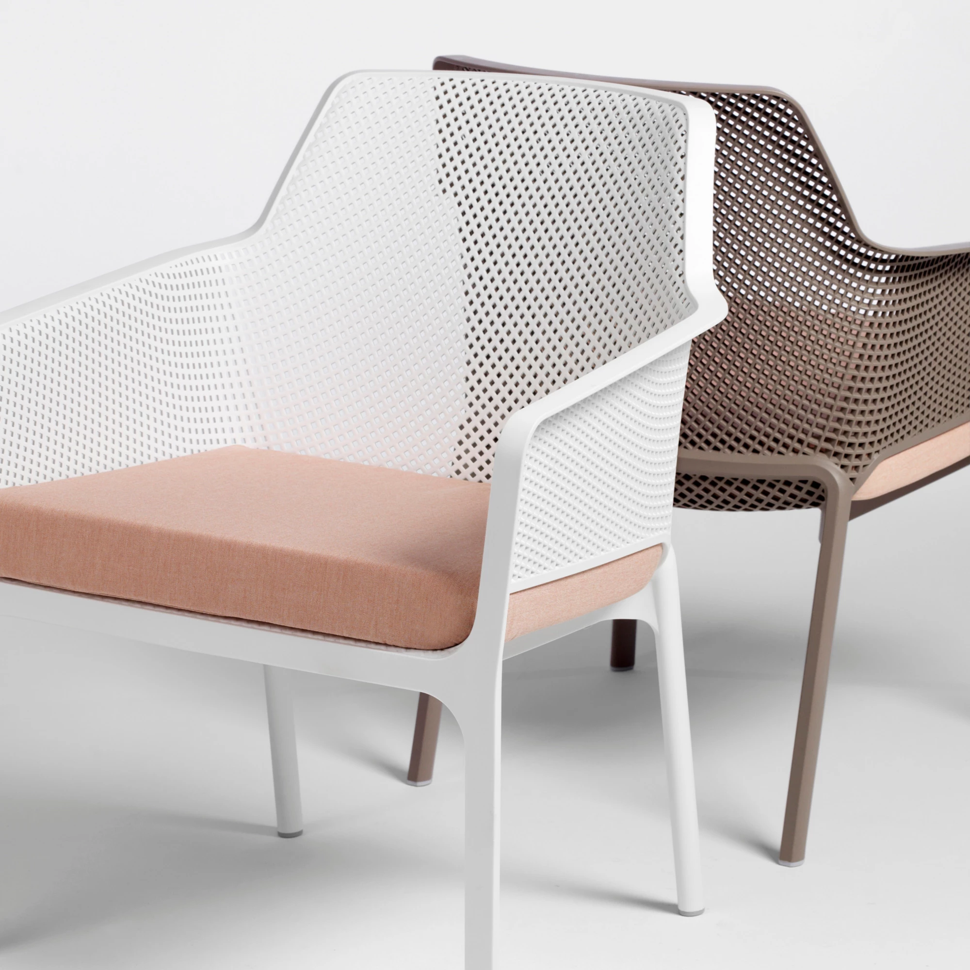 Net Relax este fotoliul perfect ce îmbină confortul, eleganța și durabilitatea pentru spațiile HoReCa. Realizat din polipropilenă cu fibră de sticlă și finisaj mat, dispune de picioare antiderapante și design stivuibil pentru depozitare eficientă. Rezistent la intemperii și raze UV, este ideal pentru utilizare intensivă în aer liber. Disponibil în culorile cadrului: Alb, Antracit, Salice, Tortora, Senape, Coral și cu perne din spumă poliuretanică (densitate 28 kg/m³) în nuanțe Grey Stone, Rosa Quarzo, Senape, Denim, The Verde, Sardinia, Alb sau Gri. Creat pentru terase de restaurante, cafenele și bistrouri ce caută un aspect rafinat și rezistență de lungă durată.