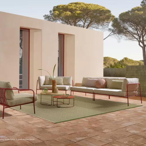 O canapea de exterior cu linii simple și iconice, creată pentru momente de relaxare și convivialitate în aer liber. Designul său evocă originile unei tradiții îndelungate în mobilierul metalic pentru exterior, păstrând transparența și lejeritatea care definesc întreaga colecție.