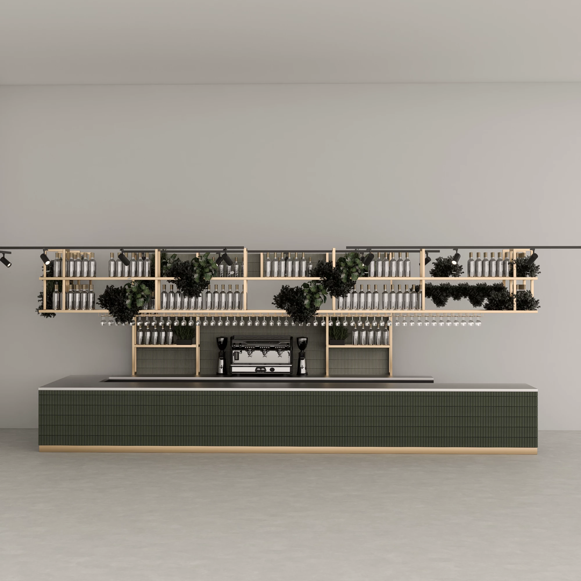 Above the counter, the hanging frame and backwall frame—crafted from 4x4 cm powder-coated metal in a gold finish—add a luxurious structural accent. Their geometric simplicity brings sophistication while gently framing the display area.