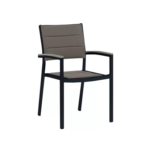 Scaunul Vicki din aluminiu cu textilenă combină eleganța cu confortul și durabilitatea. Realizat dintr-un cadru sudat solid din aluminiu, cu țevi de 38×19×1.2 mm, oferă stabilitate și este ușor de manevrat. Finisajul cu pulbere asigură o protecție superioară, ideal pentru utilizarea îndelungată în aer liber. Șezutul și spătarul sunt umplute cu vată moale (doll cotton) pentru un confort sporit. Țesătura textilenă respirabilă este perfectă pentru zilele călduroase, iar cotierele din lemn PS adaugă un aspect natural și elegant. Ideal pentru terase, grădini sau balcoane, scaunul Vicki aduce stil și funcționalitate în orice spațiu.