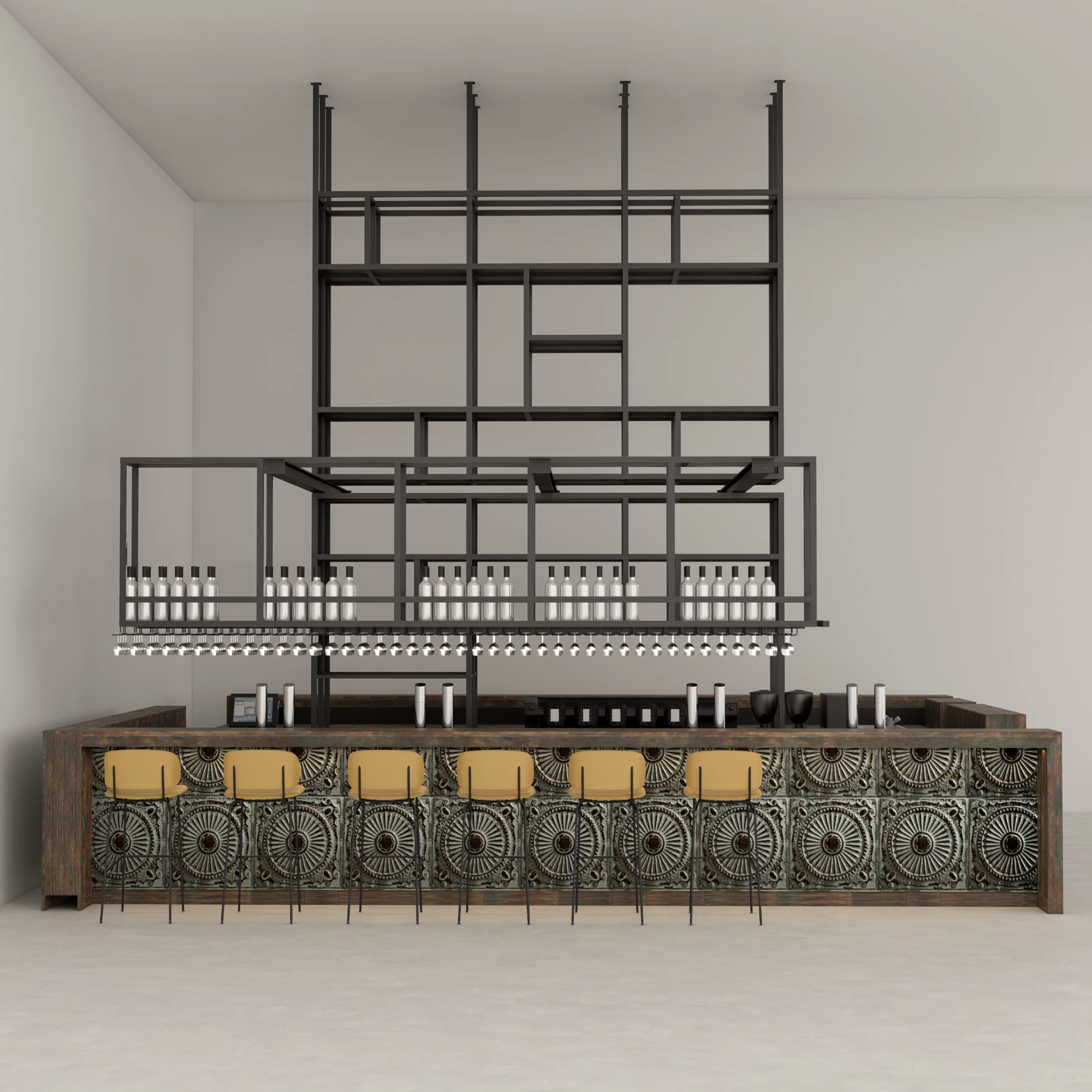A bar designed for modern hospitality spaces, merging warmth, metallic sophistication, and architectural style into a refined centerpiece.